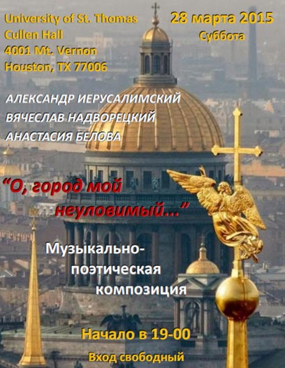 Многие поколения петербуржцев повторяли, как свое, пушкинское признание: “Люблю тебя Петра творенье….” Однако, воображение поэтов и романистов издавна тревожил и волновал еще и другой образ города: фантасмагоричный, зыбкий, как мираж. ” Самым фантастическим городом в мире” назвал Петербург Достоевский. И на какие только невероятные сюжеты не вдохновлял этот загадочный, “бесноватый” город, в котором “все обман, все мечта, все не то, чем кажется”. “О, город мой неуловимый…” это композиция, основанная на произведениях поэтов и писателей XIX и XX веков собственно и создавших этот мистический образ города-миража. В программу включены фрагменты музыкальных произведений композиторов Г. Свиридова, П. Чайковского, С. Рахманинова Д. Шостаковича, песни российских бардов. Композиция была показана Хьюстонскому зрителю в 2015-2016 годах, и позднее восстановлена для гастролей в Остине в 2020.
