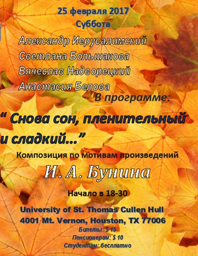 Эта театральная работа построена на произведениях Ивана Бунина – первого русского писателя, получившего Нобелевскую премию по литературе. Автор программы Александр Иерусалимский и её участники попытались выстроить Бунинскую поэзию и прозу в цельный спектакль, окрашенный в осенние краски. Композиция задумана, как красивый и немного грустный гимн ушедшей эпохи. В нее включены лирика Бунина, а также два коротких рассказа «В Париже» и «Тёмные аллеи», преобразованные в мини-пьесы. В спектакле звучит музыка Л.Бетховена, Ф.Шопена, И.Шварца Л. Бенко, Ф. Лэя, Ж. Маснэ, романсы на стихи И. Бунина, А. Пушкина, Б. Окуджавы. Спектакль прошёл несколько раз с успехом в Хьюстоне и в Остине в 2017-2019.